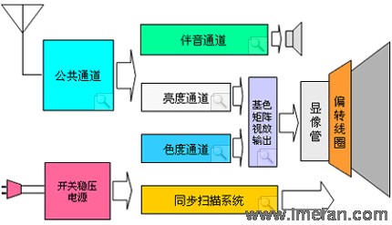 公共通道是由高频调谐器(高频头)、图像中放、视频检波和预视放,另外还有消噪、AGC和AFT等电路组成。工作过程如下: