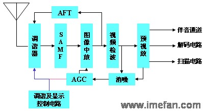 电视天线接收到高频电视信号后,首先通过高频头选出欲接收频道信号送入高放级进行放大,然后在混频级和本振信号进行混频,转换为中频电视信号送到声表面波滤波器(SAWF),利用它的幅-频特性,获得需要的图像中放电路的振幅传输特性,从而获得所需的中频信号的频带特性。随后再送入中放进行放大,由视频检波器进行检波,输出视频彩色全电视机信号。