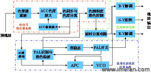 1.色度信号预处理电路包括色带通滤波器、ACC(自动色度控制)色度放大电路、色同步与色度分离电路。色饱和度及消色控制电路。