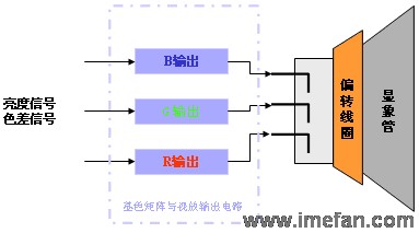 首先彩色全电视信号经过4.43MHz陷波器及亮度延迟放大级,滤除色度信号 并把亮度信号延迟约0.4us~0.8us,使亮度和色度信号能同时到达解码矩阵电路,避免发生彩色镶边现象。轮廓校正电路多采用微分电路来增强图像轮廓。黑电平 钳位电路可以恢复亮度信号的直流平均分量,提高彩****像质量;还为设置自动亮度限制电路(ABL)提供了电路基础。此外,在亮度通道末端,还要设置行、 场消隐电路,将消隐脉冲叠加到亮度信号电平上。 后亮度信号送至基色矩阵与视放输出电路。