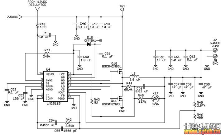 图3:转换器输出端串联配置 图 4 是可提供 5.0VDC 电压、 7A 电流的同步降压转换器。在该输出范围内,这是一种典型的降压转换器。所使用的 MOSFETs 具有和有源钳位同步整流器类似的要求,因此使用相同的MOSFET。通过电感周围的 DCR 检测电路提供电流检测。电流检测电阻只会造成能量的浪费,并且成本也是相当昂贵。