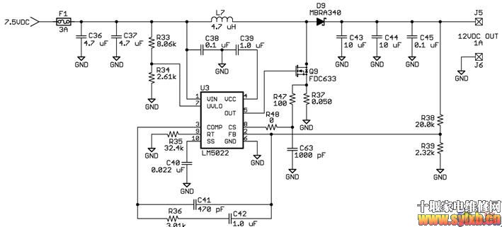 图5是一个可提供 12.0VDC 电压、 1A 电流的非同步升压转换器。它是一个很普通的设计,但有一点值得一提。如果将升压转换器的输出端短路,则它不能阻止短路作用到输入电压,因为没有在线开关阻止它。如图所示,有时用一个可快速起作用的保险丝阻止任何意外的发生倒是个挺不错的主意。