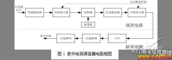 整个数字电视调谐器由两部分功能电路组成。如图所示,前端的调谐电路,负责射频接收、变频、滤波以及自动增益控制等功能,该部分电路除了要实现信号接收的基本功能,还要处理好信号干扰问题,常见的如镜像信号干扰、临频道干扰等问题,模拟电视中干扰会带来多条图线,而数字电视中干扰严重时可直接导致信号的丢失;后端的解调电路,负责A/D转换、解调以及纠错解码等功能。