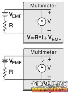图 1 使用两次测量的偏置补偿。第一次测量是标准欧姆测量; 第二次是测量热电动势产生的偏置量。电压表读数是这两次测量的差除以已知电流源。