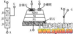 1、可控硅元件的结构 不管可控硅的外形如何,它们的管芯都是由P型硅和N型硅组成的四层P1N1P2N2结构。见图1。它有三个PN结(J1、J2、J3),从J1结构的P1层引出阳极A,从N2层引出阴级K,从P2层引出控制极G,所以它是一种四层三端的半导体器件。
