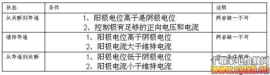 当阳极A加上正向电压时,BG1和BG2管均处于放大状态。此时,如果从控制极G输入一个正向触发信号,BG2便有基流ib2流过,经BG2放大,其集电极电流ic2=β2ib2。因为BG2的集电极直接与BG1的基极相连,所以ib1=ic2。此时,电流ic2再经BG1放大,于是BG1的集电极电流ic1=β1ib1=β1β2ib2。这个电流又流回到BG2的基极,表成正反馈,使ib2不断增大,如此正向馈循环的结果,两个管子的电流剧增,可控硅使饱和导通。 由于BG1和BG2所构成的正反馈作用,所以一旦可控硅导通后,即使控制极G的电流消失了,可控硅仍然能够维持导通状态,由于触发信号只起触发作用,没有关断功能,所以这种可控硅是不可关断的。 由于可控硅只有导通和关断两种工作状态,所以它具有开关特性,这种特性需要一定的条件才能转化,此条件见表1