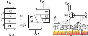2、工作原理 可控硅是P1N1P2N2四层三端结构元件,共有三个PN结,分析原理时,可以把它看作由一个PNP管和一个NPN管所组成,其等效图解如图1所示