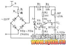 8、在可控整流电路的波形图中,发现可控硅承受正向电压的每半个周期内,发出第一个触发脉冲的时刻都相同,也就是控制角α和导通角θ都相等,那么,单结晶体管张弛振荡器怎样才能与交流电源准确地配合以实现有效的控制呢? 为了实现整流电路输出电压“可控”,必须使可控硅承受正向电压的每半个周期内,触发电路发出第一个触发脉冲的时刻都相同,这种相互配合的工作方式,称为触发脉冲与电源同步。 怎样才能做到同步呢?大家再看调压器的电路图(图1)。请注意,在这里单结晶体管张弛振荡器的电源是取自桥式整流电路输出的全波脉冲直流电压。在可控硅没有导通时,张弛振荡器的电容器C被电源充电,UC按指数规律上升到峰点电压UP时,单结晶体管VT导通,在VS导通期间,负载RL上有交流电压和电流,与此同时,导通的VS两端电压降很小,迫使张弛振荡器停止工作。当交流电压过零瞬间,可控硅VS被迫关断,张弛振荡器得电,又开始给电容器C充电,重复以上过程。这样,每次交流电压过零后,张弛振荡器发出第一个触发脉冲的时刻都相同,这个时刻取决于RP的阻值和C的电容量。调节RP的阻值,就可以改变电容器C的充电时间,也就改变了第一个Ug发出的时刻,相应地改变了可控硅的控制角,使负载RL上输出电压的平均值发生变化,达到调压的目的。 双向可控硅的T1和T2不能互换。否则会损坏管子和相关的控制电路。
