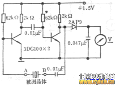图示线路当A、B端来接上石英晶体时,万用表电压档指示约为0.75V。当接上石英晶体后,电路应起振,同时电压即升高,一般应在1.26V左右。如符合上述要求,则说明该被测石英晶体是可以用的。如果接上石英晶体后,电压指示无变化,则说明该被测石英晶体已失效,没有使用价值了。 图示线路中要求晶体三极管p高一些,以便在低电压下能起振,三极管集电极电流调在0.3mA左右。