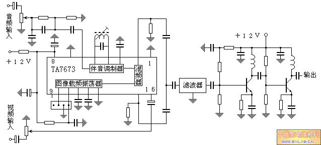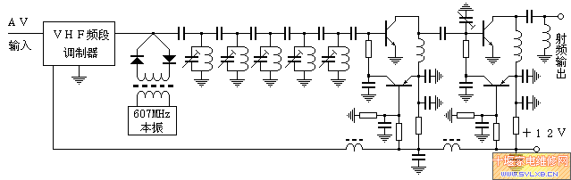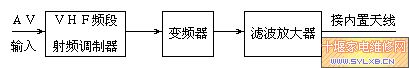 | 市场上1200MHz的微波无线影音系统大行其道,其实,采用电视广播频段调幅方式传输的影音微功率器材也有其独特的优点:一是采用电视广播频段,以普通电视机接收,使用简单方便;二是价格低廉,便于普及应用。 这款发射器采用800MHz以上频段发射(目前我国电视广播频段中800MHz以上频率没有人使用),极少有干扰。采用塑料外壳,便于配用内置发射天线,插上电源和信号源即可投入运行。 发射器的工作频率可选定750-860MHz的任意电http://www.sylxb.cn/movie/' target='_blank' class='infotextkey'>视频道,由晶体锁定,不可调。800MHz以下的个别频道有可能被当地电视广播占用,不推荐选用,800MHz以上则无此问题。不过工作频率也不宜过高,由于我国目前尚无800MHz以上的开路电视信号,因此有些电视机出厂时也不大注意其接收上限频道的性能。 发射器输出功率10毫瓦,能满足普通住宅各个房间的信号传输。工作电源12V200mA。 外形尺寸136×92×26mm。 该影音发射器的电路结构与本厂传统的高电平输出UHF调制器没有大的不同,也是由VHF调制器、变频器和滤波放大器组成,如下图所示。  其中VHF频段射频调制器是很普通的调制器,没有什么特别,如下图所示。
