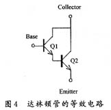 达林顿管是两个双极性晶体管的复合。达林顿管的 大优点就是实现电流的多级放大,如图4所示。缺点就是饱和管压降较大。由于两个晶体管共集电极,整个达林顿管的饱和电压等于晶体管Q2的正向偏置电压与晶体管Q1的饱和电压之和,而正向偏置电压比饱和电压高得多,这样整个达林顿管的饱和电压就特别的高,因此达林顿管导通时的功耗较高。