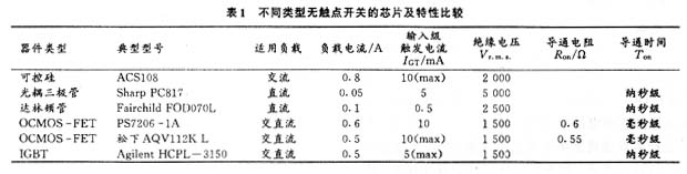 为了方便设计者选用合适的电路,表1给出了不同类型无触点开关的参考芯片,并比较了各 芯片的开关特性。