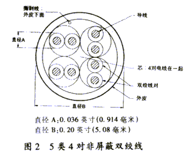 | 图2 5类4对非屏蔽双绞线  javascript:window.open(this.src);" style="cursor: pointer;"/> | 电气特性如表5所示。其中,"9.38 欧姆MAX. Per100m @ 20℃"是指在20℃的恒定温度下,每100米的双绞线的电阻为9.38 欧姆(下表中类同)。 | 表5 5类4对非屏蔽双绞线电气特性