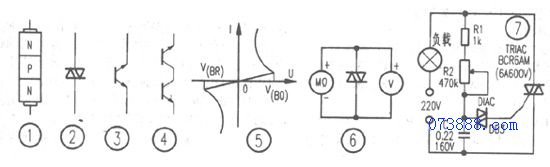 图7是双向触发二极管与双向可控硅等元件构成的台灯调光电路。通过调节电位器R2,可以改变双向可控硅的导通角,从而改变通过灯泡的电流(平均值)实现连续调光。如果将灯泡换电熨斗、电热褥还可实现连续调温。