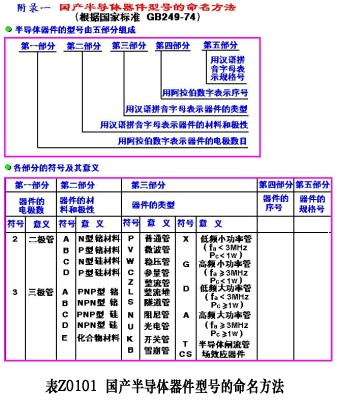 二极管的型号命名通常根据国家标准GB-249-74规定,由五部分组成。第一部分用数字表示器件电极的数目;第二部分用汉语拼音字母表示器件材料和极性;第三部分用汉语拼音字母表示器件的类型;第四部分用数字表示器件序号;第五部分用汉语拼音字母表示规格号。如表Z101所示。