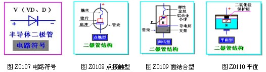 晶体二极管也称半导体二极管,它是在PN结上加接触电极、引线和管壳封装而成的。按其结构,通常有点接触型和面结型两类。常用符号如图Z0107中V、VD(本资料用D)来表示。