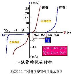 二极管的伏安特性是指流过二极管的电流iD与加于二极管两端的电压uD之间的关系或曲线。用逐点测量的方法测绘出来或用晶体管图示仪显示出来的U~I曲线,称二极管的伏安特性曲线。图Z0111 是二极管的伏安特性曲线示意图,依此为例说明其特性。