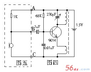 用一只动圈话筒接在图四的B、C端,中波收音机调到无台处,把图四电路靠近收音机,调整可变电容使电路振荡频率与中波接收频率相同。当你对着话筒唱歌时,收音机就会发现响亮的声音。