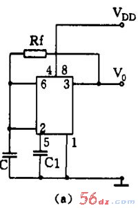 另一路多谐振荡器是把反馈电阻接在放电端和电源上,如图 8 ( a ),这样做使振荡电路和输出电路分开,可以使负载能力加大,频率更稳定。这是目前使用 多的 555 振荡电路。
