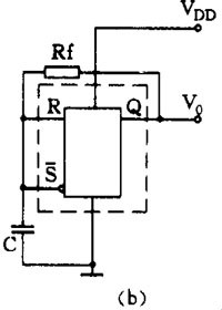 利用 555 施密特触发器的回滞特性,在它的输入端接电容 C ,再在输出 V 0 与输入之间接一个反馈电阻 R f ,就能组成直接反馈型多谐振荡器,见图 7 ( a )。用等效触发器替代 555 电路后可画成图 7 ( b )。现在来看看它的振荡工作原理: