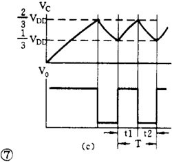 刚接通电源时, C 上电压为零,输出 V 0 =1 。通电后电源经内部电阻、 V 0 端、 R f 向 C 充电,当 C 上电压升到> 2 /3 V DD 时,触发器翻转 V 0 =0 ,于是 C 上电荷通过 R f 和 V 0 放电入地。当 C 上电压降到< 1 /3 V DD 时,触发器又翻转成 V 0 =1 。电源又向 C 充电,不断重复上述过程。由于施密特触发器有 2 个不同的阀值电压,因此 C 就在这 2 个阀值电压之间交替地充电和放电,输出得到的是一串连续的矩形脉冲,见图 7 ( c )。脉冲频率约为 f=0.722 / R f C 。