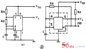 这个电路在刚通电时, V 0 =1 , DIS 端开路, C 的充电路径是:电源 →R A →DIS→R B →C ,当 C 上电压上升到> 2 /3 V DD 时, V 0 =1 , DIS 端接地, C 放电, C 放电的路径是: C→R B →DIS→ 地。可以看到充电和放电时间常数不等,输出不是方波。 t 1 =0.693 ( R A + B B ) C 、 t 2 =0.693R B C ,脉冲频率 f=1.443 /( R A + 2R ) C