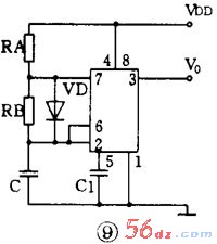 要想得到方波输出,可以用图 9 的电路。它是在图 8 的电路基础上在 R B 两端并联一个二极管 VD 组成的。当 R A =R B 时, C 的充放电时间常数相等,输出就得到方波。方波的频率为 f=0.722 / R A C ( R A =R B )