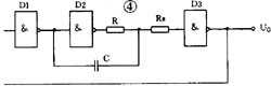 图 4 是常用的 RC 环形振荡器。它用奇数个门、首尾相连组成闭环形,环路中有 RC 延时电路。图中 RS 是保护电阻, R 和 C 是延时电路元件,它们的数值决定脉冲周期。输出脉冲周期 T=2.2RC 。如果把 R 换成电位器,就成为脉冲频率可调的多谐振荡器。因为这种电路简单可靠,使用方便,频率范围宽,可以从几赫变化到几兆赫,所以被广泛应用。