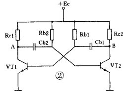 图 2 是一个典型的分立元件集基耦合多谐振荡器。它由两个晶体管反相器经 RC 电路交叉耦合接成正反馈电路组成。两个电容器交替充放电使两管交替导通和截止,使电路不停地从一个状态自动翻转到另一个状态,形成自激振荡。从 A 点或 B 点可得到输出脉冲。当 R b1 =R b2 =R , C b1 =C b2 =C 时,输出是幅度接近 E 的方波,脉冲周期 T=1.4RC 。如果两边不对称,则输出是矩形脉冲