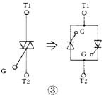 教师:双向晶闸管相当于两个单向晶闸管的反向并联(图 3 ),但只有一个控制极。这样,双向晶闸管在正、反两个方向上都能够控制导电,而单向晶闸管却是一种可控的单方向导电器件。给双向晶闸管的控制极加正的或负的触发脉冲,都能使管子触发导通。这样,触发电路的设计就具有很大的灵活性,可以采用多种不同的触发方式。此外,双向晶闸管的两个主电极不再分为阳极和阴极,而是称为第一电极 T1 和第二电极 T2 。双向晶闸管在电路中不能用作可控整流元件,主要用来进行交流调压、交流开关、可逆直流调速等等。