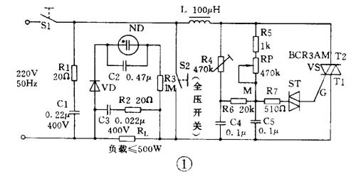 老师:可以。这就是一个简易型调压器,在要求不高的场合(如灯具调光)完全可以使用。这种调压器的缺点有两个:一是负载RL 上的电压不能从零伏起调, 低只能调到 20V 。当 RP 调到 大值时, C5 充电速度变得很慢,以致在交流电压的半个周期时间内, C5 上的电压还来不及上升到双向触发二极管的转折电压,双向晶闸管就不能导通。为了克服这一缺陷,增加了由 R4 、 C4 和 R6 组成的另一条阻容移相电路(图 1 )。当 RP 调到极限值以上时, C4 上的电压可经 R6 向 C5 充电,使 C5 上的电压达到双向触发二极管的转折电压,以保证在低输出电压下双向晶闸管仍能导通。适当调节 R4 ,就可以得到较低的起调电压。另一个缺点是双向晶闸管导通瞬间的突变电流形成的脉冲干扰,会影响调幅收音机和一些通信设备的正常工作,简易型调压器不能抑制这种脉冲干扰。