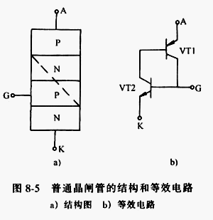 普通晶闸管的阳极与阴极之间具有单向导电的性能,其内部可以等效为由一只PNP晶闸管和一只NPN晶闸管组成的组合管,如图8-5所示。