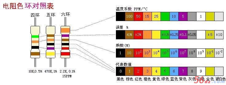 带有四个色环的其中第一、二环分别代表阻值的前两位数;第三环代表倍率;第四环代表误差。快速识别的关键在于根据第三环的颜色把阻值确定在某一数量级范围内,例如是几点几k、还是几十几k的,再将前两环读出的数"代"进去,这样就可很快读出数来。