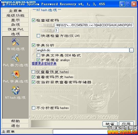 运行界面 要查看并找回所有的用户账号及密码,就需要单击“选项”项下的“NT hash 选项”按钮,在出现的右侧界面下把“仅查看恢复 hashes”项前的对勾取消掉,因为在默认情况下PSPR不会显示全部用户密码,而只能看到非管理员用户,再单击“应用”按钮(如图)。