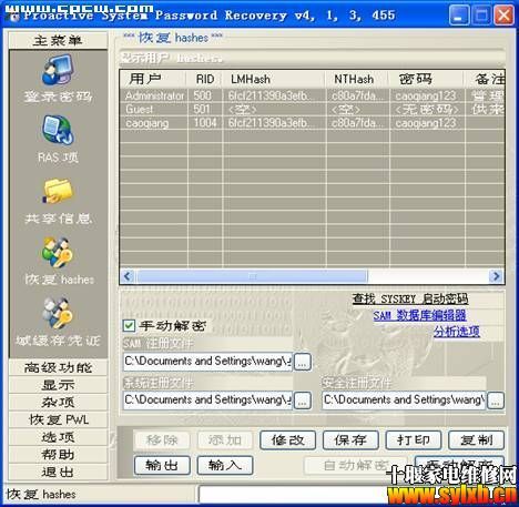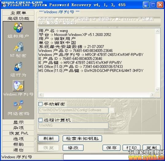 选项 设置好后,再次单击“主菜单”回到“恢复 hashes”界面,这下就可以单击其右下角的“手动解密”按钮了,很快就可以得到Win XP的所有账户及密码了(如图)。 接下来重新启动电脑,输入得到的用户账号及密码,就可以顺利的进入Windows XP了。 二、异地“找回”Windows XP账户密码 如果一时没有找到能启动到Windows PE环境的启动闪存,可以使用一般的启动闪存启动忘记登录密码的电脑,启动成功后,复制出系统盘中SAM、SYSTEM、SECURITY这三个文件到闪存中,再复制到一台能正常运行XP的电脑中,接下来运行PSPR,在图2的界面中把这三个文件的路径指向刚复制到的文件夹,再单击“手动解密 ”按钮,很快就能得到Windows XP账户及密码了,这样是不是更方便? 以上践作是用Windows XP试验成功,其实PSPR对于Windows 95/98/ME/NT4/2000/XP/2003等系统的登录密码都可以找回,还拥有查看Windows系统的安装时间、ID及序列号等信息、微软Office和其它微软的安装软件的D及序列号(如图),找出屏保护密码、.NET 护照密码、RAS 和拨号密码、共享资源密码、SYSKEY 启动密码、存储在缓存的凭证密码、无线 (WEP 和 WPA-PSK) 加密键等功能。同时也能显示出隐藏在星号下的密码。功能十分强大,是我们维护电脑的好助手。