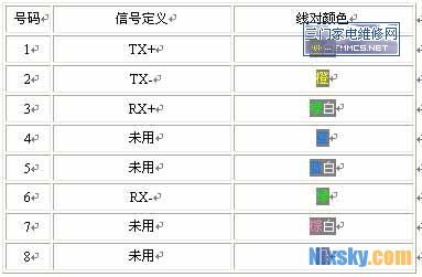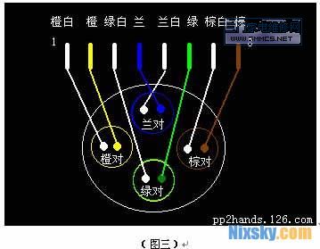 1->橙白 2->橙 3->绿白 4->蓝 5->蓝白 6->绿 7->棕白 8->棕 而且,使用电缆两头一对一的连接方式, 会使一组信号(负电压信号)通过不绞合在一起的两根芯线传输,造成极大的近端串扰(NEXT-> Near-end-crosstalk)所以应按照国际标准打线!!