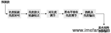 首先彩色全电视信号经过4.43MHz陷波器及亮度延迟放大级,滤除色度信号 并把亮度信号延迟约0.4us~0.8us,使亮度和色度信号能同时到达解码矩阵电路,避免发生彩色镶边现象。轮廓校正电路多采用微分电路来增强图像轮廓。黑电平 钳位电路可以恢复亮度信号的直流平均分量,提高彩****像质量;还为设置自动亮度限制电路(ABL)提供了电路基础。此外,在亮度通道末端,还要设置行、 场消隐电路,将消隐脉冲叠加到亮度信号电平上。 后亮度信号送至基色矩阵与视放输出电路。