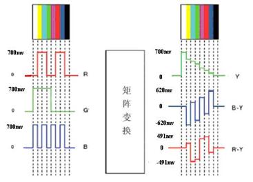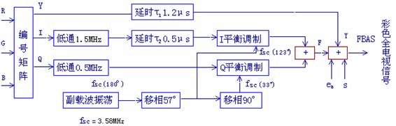 编码是将三基色信号转换成彩色全电视信号的过程。在对三基色信号进行编码时,首先是将R、G、B基色信号通过编码矩阵变换成Y、R-Y、B-Y(或I、Q)信号。