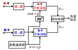 然后,Y信号延时等处理,对色差信号进行正交平衡调幅, 后再叠加上复合同步信号、复合消隐信号就构成彩色全电视信号。