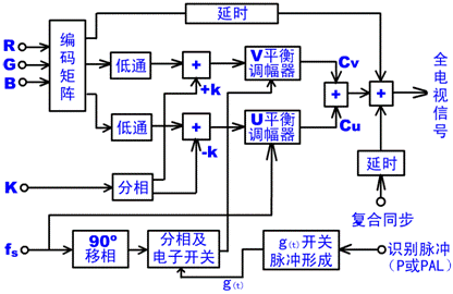 PAL制编码器的作用与NTSC制编码器一样,也是将彩色摄像机摄取的三基色信号编码成彩色全电视信号。