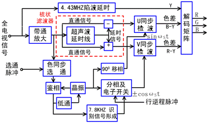 PAL制解码器的作用与NTSC制解码器作用一样,都是实现从彩色全电视信号中恢复出三基色信号R 、G 、B。目前PAL制彩色电视机广泛采用延时线型解码器,其中包括:亮度通道、色度通道、基准副载波恢复电路和解码矩阵电路等四个组成部分。