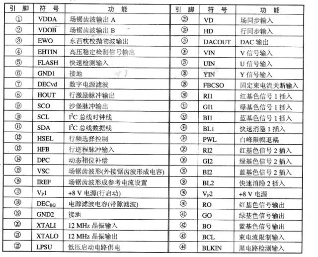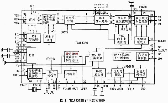 TDA9332H具有44个引脚,各引脚功能如表1所列。图2所示为其内部结构框图。