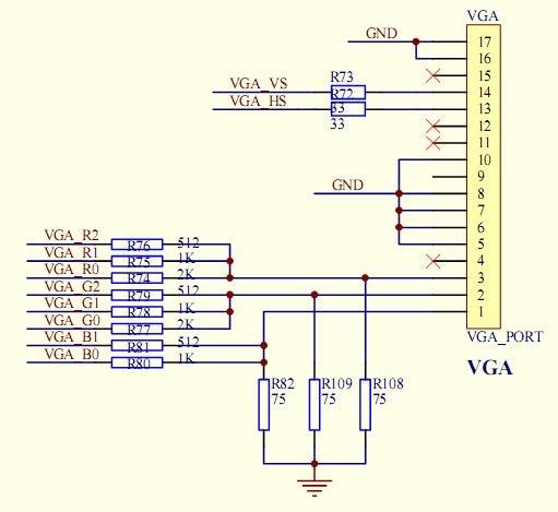 利用IO口和电阻网络控制VGA像素颜色接口之方法如上图所示,电阻选值计算方法如下: