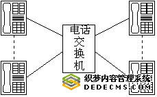 星型结构是 古老的一种连接方式,大家每天都使用的电话都属于这种结构,如图3所示。其中,图2(a)为电话网的星型结构,图2(b)为目前使用 普遍的以太网星型结构,处于 中心位置的网络设备称为集线器,英文名为Hub。