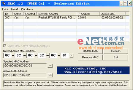 软件的使用非常简单,运行后点击“Refresh”,窗口中的列表框将显示网卡的类型、IP地址、Active MAC等,在下面六个输入框中输入你指定的MAC地址(图1),然后点击右侧的“Update MAC”,即可修改完成; 后重启http://www.enet.com.cn/notebook/' target='_blank' class='article'>电脑使修改值生效。