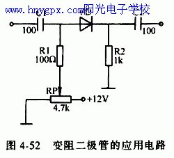 1.变阻二极管的作用及特性 变阻二极管是利用pn结之间等效电阻可变的原理制成的半导体器件,主要用在10~1000mhz高频电路或开关电源等电路中作可调衰减器,起限幅、保护等作用。 变阻二极管的等效电阻,随加在二极管两端的正向偏置电压的大小变化而改变。当二极管两端的正向偏压增高时,二极管的正向电流将增大,其等效内阻将减小;当二极管两端的正向偏压降压时,二极管的正向电流也随之减小,其等效内阻将增大。当二极管的外加偏置电压固定时,二极管的等效电阻会保持稳定。 变阻二极管一般采用轴向塑料封装,如图4-51所示。图4-52是其应用电路。
