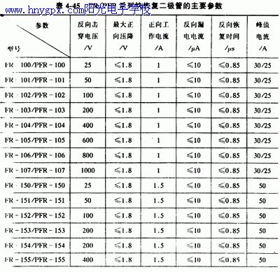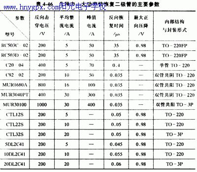 600) this.width = 600;"> 采用to–220或to–3p封装的大功率快恢复二极管,有单管和****之分。双管的管脚引出方式又分为共阳和共阴,如图4-50所示。 2.常用的快恢复二极管 常用的小功率快恢复二极管有fr系列和pfr系列等,其主要参数见表4-45。常用的中、大功率快恢复二极管有rc系列、mur系列、ctl系列等其主要参数见表4-46。 600) this.width = 600;">