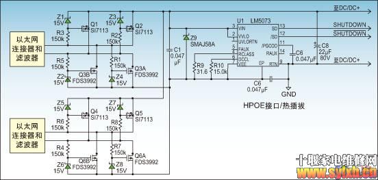 高功率以太网供电( HPOE)标准至今仍未确定。多数人所期望的标准是:供电电压增至 53VDC 、每根线的可用电流达到 750mA 、电缆总阻抗不超过 12.5 欧姆。如果有人期望设计成 46VDC (标称 48V)电压、720mA电流、电缆阻抗为 12.5 欧姆,那或许将是 差的情形。因为在 720mA 时,电缆会产生9VDC 的压降,剩下可用于工作的电压为37VDC。这样电缆末端的输出功率约 26.6W ,紧随其后的典型功率电路只能产生略高于 20W的功率 。不幸地是针对许多应用来说,这仍不是充足的功率。一个解决办法是使用多个以太网线,但这会出现功率分配问题。下面的例子为该问题作了解答。 传统的 HPOE 接口由一个极性保护桥式整流器和一个带有以太网供电接口的热插拔部件组成。在HPOE接口之后是一个能提供稳定输出的隔离转换器。 好的情况是这些输出不依赖于负载,而且它们均具有良好的瞬态响应。那些在当时看来做出过贡献的典型设计采用了隔离式反馈来产生电压(典型值为 5.0VDC),该电压然后转换成所需的其它电压值。通常,多个输出试图共用一个反馈环路,但如果这样的话稳压将更多地依赖于负载。无论是哪种情况,桥式整流器和转换器的损耗将带来十分糟糕的效率。而且,隔离反馈环路也将产生十分糟糕的瞬态响应。令人遗憾的是, 就HPOE来说,其整体要点是要在不牺牲性能的前提下从尽可能少的以太网网线上获取更多的有用功率。