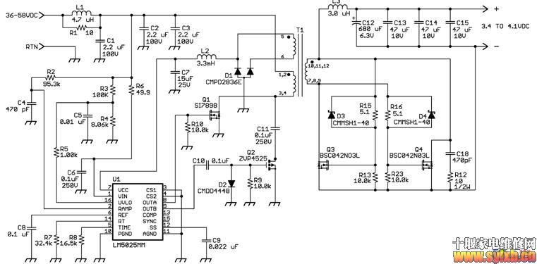图2是两个直流-直流转换器中的一个。有源钳位前向转换器可提供非常高的效率,并能消除隔离式反馈的需求。 LM5020 有源钳位控制器具有控制 大工作系数的功能。在电容(C4)上会产生一个斜坡,进而控制工作系数。如果 C4 通过一个电阻( R2)与输入电压相连,则工作系数与输入电压成反比例关系,并产生一个近乎恒定的输出电压。幸运地是,无需反馈且能提供卓越稳压性能的 1% 精度电容在今天仅需几美分。由于除去了这些器件,因此设计不再会有各种电流检测或限制引起的任何损耗。前向转换器之前的热插拔部件中的电流限制以及输出端的后稳压器中的电流限制可提供充分的保护,并简化设计。通过模仿稳压次级侧整流器/电感电路来提供一个具有良好稳压特性的 Vcc 。 LM5025 控制器所需电流仅约 10mA ,因此需要很大值的电感来防止峰值充电,因为整流器并不同步。但由于电流非常小,因此可用一个直流阻抗( DCR)约 32 欧姆且封装很小的电感。从高输入电压供电的线性稳压器具备这个功能,但功率损失相当大,而成本却相当。