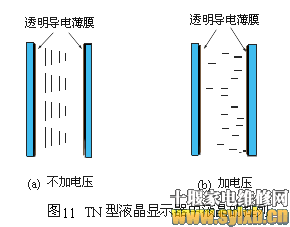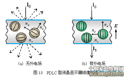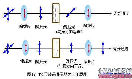 </Script> | 液晶显示器(LCD)是现在非常普遍的显示器。它具有体积小、重量轻、省电、辐射低、易于携带等优点。液晶显示器(LCD)的原理与阴极射线管显示器(CRT)大不相同。LCD是基于液晶电光效应的显示器件。包括段显示方式的字符段显示器件;矩阵显示方式的字符、图形、图像显示器件;矩阵显示方式的大屏幕液晶投影电视液晶屏等。液晶显示器的工作原理是利用液晶的物理特性,在通电时导通,使液晶排列变得有秩序,使光线容易通过;不通电时,排列则变得混乱,阻止光线通过。下面介绍三种液晶显示器的工作原理。 1.“扭曲向列型液晶显示器”(Twisted Nematic Liquid crystal display),简称“TN型液晶显示器”。这种显示器的液晶组件构造如图11所示。向列型液晶夹在两片玻璃中间。这种玻璃的表面上先镀有一层透明而导电的薄膜以作电极之用。这种薄膜通常是一种铟(Indium)和锡(Tin)的氧化物(Oxide),简称ito。然后再在有ito的玻璃上镀表面配向剂,以使液晶顺着一个特定且平行于玻璃表面之方向排列。(图11 a)中左边玻璃使液晶排成上下的方向,右边玻璃则使液晶排成垂直于图面之方向。此组件中之液晶的自然状态具有从左到右共 的扭曲, 这也是为什么被称为扭曲型液晶显示器的原因。利用电场可使液晶旋转的原理,在两电极上加上电压则会使得液晶偏振化方向转向与电场方向平行。 因为液态晶的折射率随液晶的方向而改变,其结果是光经过TN型液晶盒以后其偏振性会发生变化。我们可以选择适当的厚度使光的偏振化方向刚好改变 。那么,我们就可利用两个平行偏振片使得光完全不能通过(如图12所示)。若外加足够大的电压V使得液晶方向转成与电场方向平行,光的偏振性就不会改变。因此光可顺利通过第二个偏光器。于是,我们可利用电的开关达到控制光的明暗。这样会形成透光时为白、不透光时为黑,字符就可以显示在屏幕上了。   2.TFT型液晶显示器的原理 TFT型液晶显示器也采用了两夹层间填充液晶分子的设计。只不过是把左边夹层的电极改为了FET晶体管,而右边夹层的电极改为了共通电极。在光源设计上,TFT的显示采用"背透式"照射方式,即假想的光源路径不是像TN液晶那样的从左至右,而是从右向左,这样的作法是在液晶的背部设置了类似日光灯的光管。 光源照射时先通过右偏振片向左透出,借助液晶分子来传导光线。由于左右夹层的电极改成FET电极和共通电极,在FET电极导通时,液晶分子的表现如TN液晶的排列状态一样会发生改变,也通过遮光和透光来达到显示的目的。但不同的是,由于FET晶体管具有电容效应,能够保持电位状态,先前透光的液晶分子会一直保持这种状态,直到FET电极下一次再加电改变其排列方式为止。 相对而言,TN就没有这个特性,液晶分子一旦没有被施压,立刻就返回原始状态,这是TFT液晶和TN液晶显示原理的 大不同。 3. “高分子散布型液晶显示器”(Polymer dispersed liquid crystal liquid crystal display),简称“PDLC型液晶显示器”。这种显示器的液晶组件构造如图13所示。高分子的单体(monomer)与液晶混合后夹在两片玻璃中间,做成一液晶盒。这种玻璃与上面所用的相同,是表面上先镀有一层透明而导电的薄膜作电极。但是不需要在玻璃上镀表面配向剂。此时将液晶盒放在紫外灯下照射使个单体连结成高分子聚合物。在高分子形成的同时,液晶与高分子分开而形成许多液晶小颗粒。这些小颗粒被高分子聚合物固定住。 当光照射在此液晶盒上,因折射率不同,而在颗粒表面处产生折射及反射。经过多次反射与折射,就产生了散射(scattering)。此液晶盒就像牛奶一样呈现出不透明的乳白色。